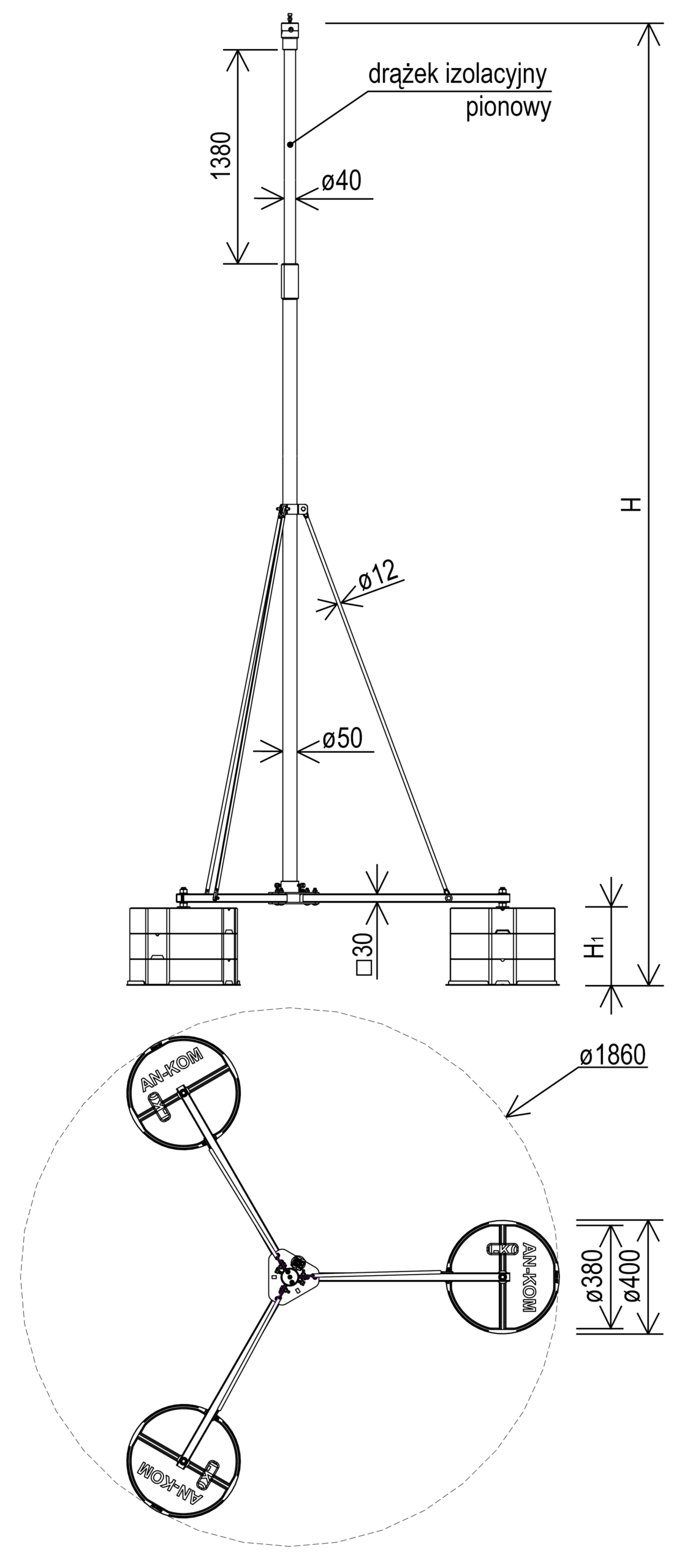 Maszt klatkowy izolowany na trójnogu.
