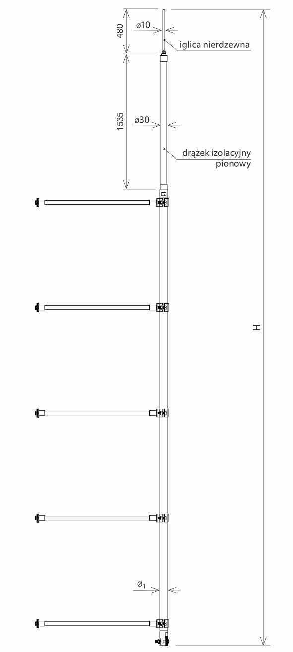 Maszty ścienne służą do ochrony urządzeń na dachach obiektów. Pionowy izolator oraz poziome drążki, które izolują płynący prąd pioruna pozwalają na przykręcenie masztu bezpośrednio do chronionego urządzenia. Oferowane w komplecie: iglica nierdzewna ze złączem, izolator pionowy 1500mm, drążki izolacyjne poziome, uchwyty drążków poziomych, uchwyty mocujące przewód odprowadzający prąd pioruna z iglicy masztu.